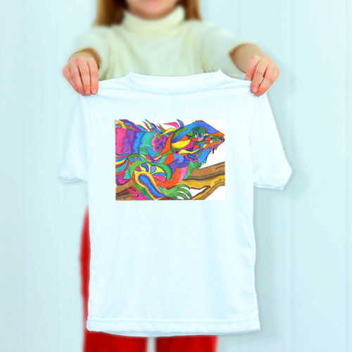 Wear your child's art wherever you go with our white T-shirt! 100% Polyester. Image won't crack or fade. Holds up well with machine washing. Size may run small - order size up if unsure. Sm(6-8), Med(10-12), Lg(14-16).