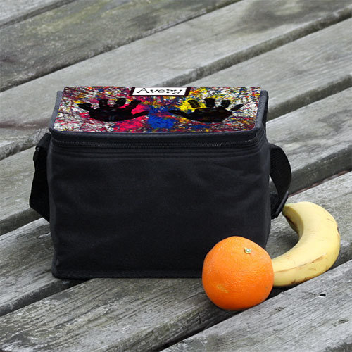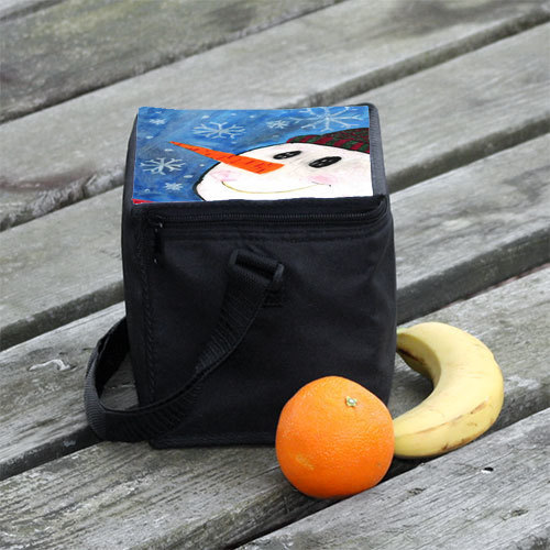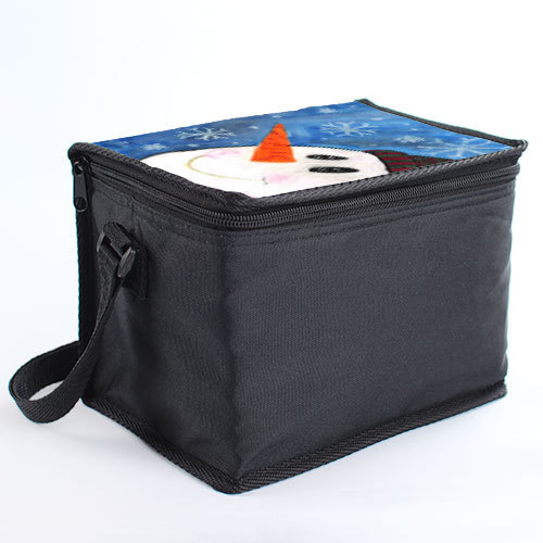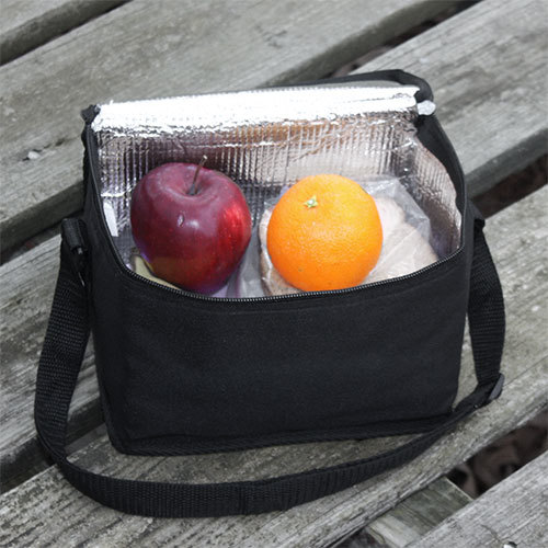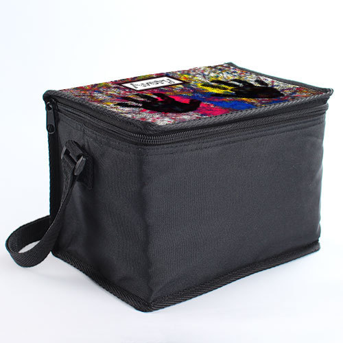 Black canvas, zippered tote with shoulder strap and food-safe insulated lining. Wipeable image on top. Size: 8.5"x6"x6"
