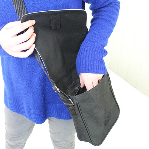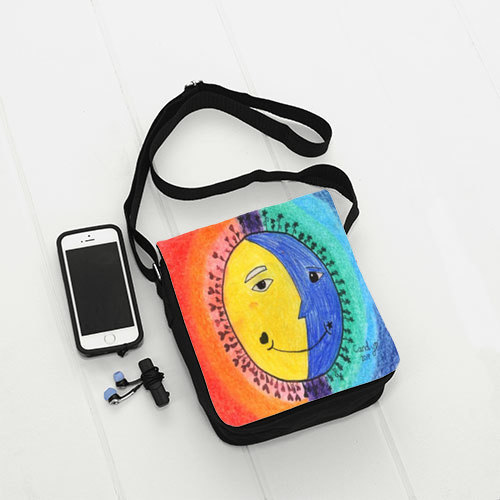 This small 8.5"x 7" shoulder bag is great for carrying around all the little necessities of life. Made of black canvas fabric with 7"x 11" image flap. Inside of bag measures 6.5” x 7” x 1.75”. Adjustable nylon strap is 42” x 1.25”.